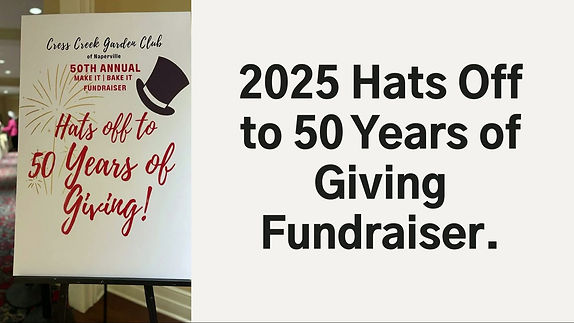 This year, Cress Creek Garden Club celebrated a successful 50th Anniversary Fundraiser on November 14, 2025. Over 350 attendees had a wonderful time with 50/50 raffles, wine raffles, boutique items, sweet shop treats, raffle baskets, silent auction items galore, and many silent auction bakery items. The 2025 "Hats Off to 50 years of Giving" is the club's major fundraiser of the year. The club holds the event at Bolingbrook Golf Club in Bolingbrook, and it includes a catered three-course luncheon. Cress Creek Garden Club thanks all sponsors, donors, and members who made this an enormous success. This event's funds support the scholarships given the following spring and donations to local non-profit organizations in Naperville and surrounding communities.